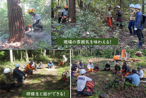 その集合研修の内、「チェーンソーによる立木伐採」と「高性能林業機械を使った伐倒木の搬出」を見学していただける機会を設けました。研修生との意見交換の時間もありますので、「林業の実際を知りたい」と思っている方は是非ご参加ください。