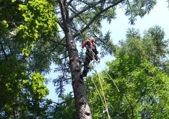 ロープで木に登り、上から少しずつ切り降ろす技術。倒す場所等が難しい場合に。